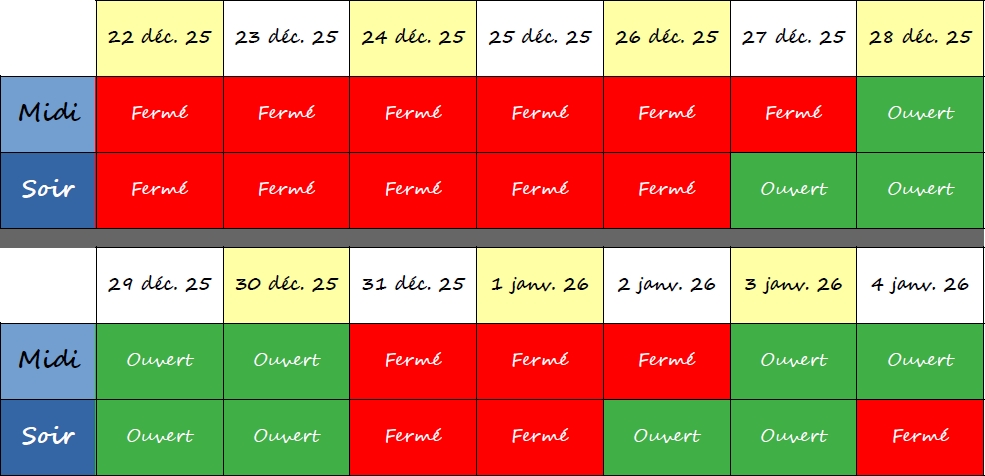 Nous sommes ouverts toute l’année du jeudi au dimanche (midi et soir) à partir de 12h et 19h.